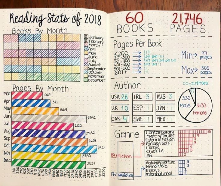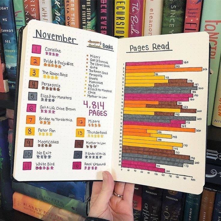Кроме описаний книг, в вашем дневнике могут быть топы прочитанных историй, книжные планы и челленджи. Например, поставьте себе задачу осилить определённое число книг за год. А в конце подведите итоги, чтобы увидеть, какие жанры лидируют в вашем списке.