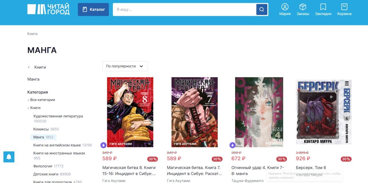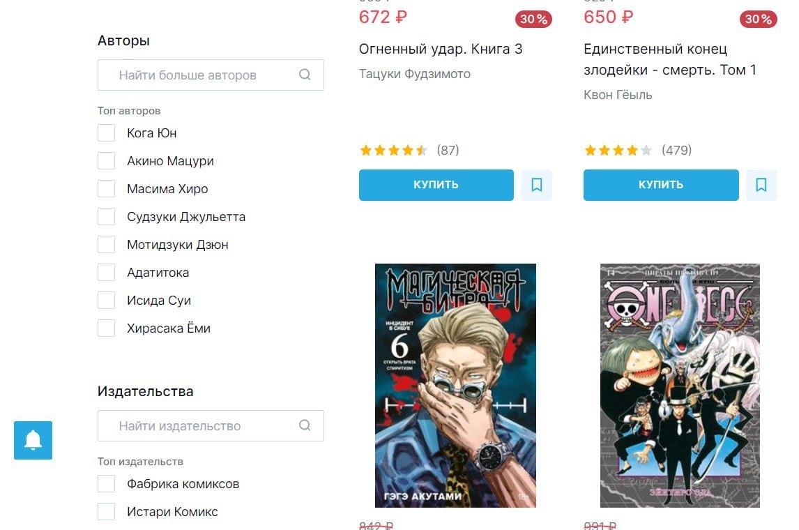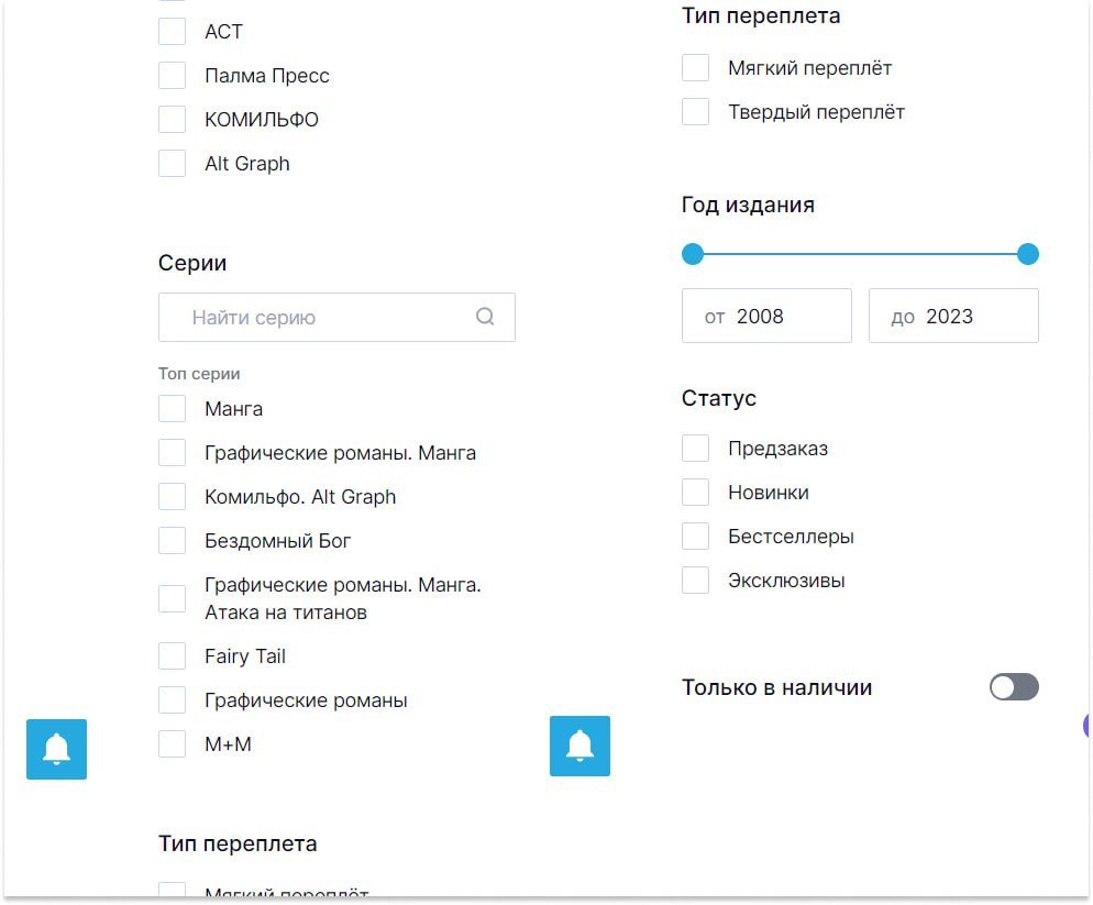 Стало легче искать нужные книги, канцтовары или сувениры благодаря фильтрам на странице с результатами поиска. Например, вы можете выбрать в каталоге мангу, а после этого конкретных авторов и издательства, которые вас интересуют.