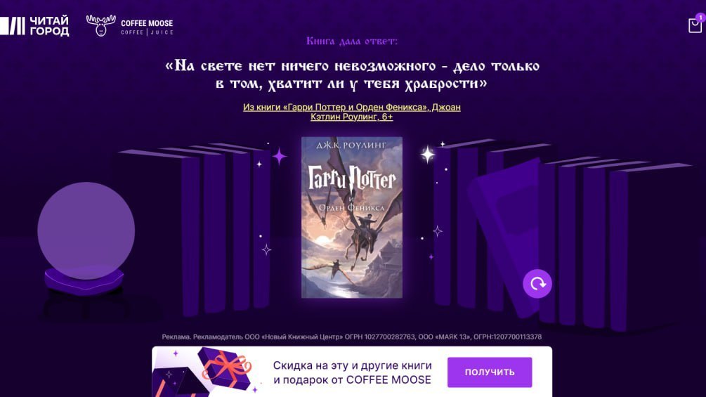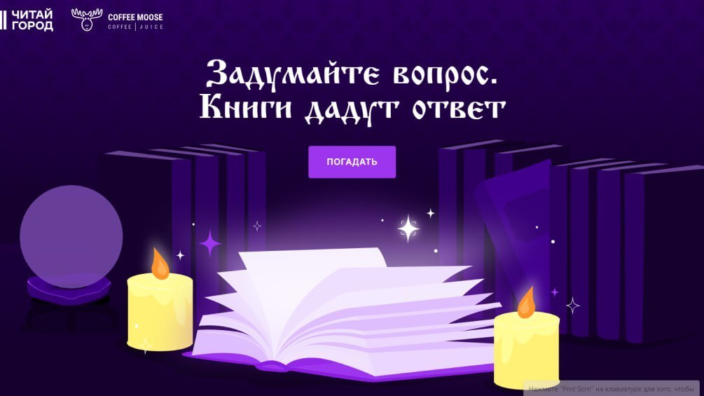 Совместно с кофейней Coffee Moose мы запустили посадочную страницу, где можно мысленно задать вопрос и получить ответ цитатой из книги.