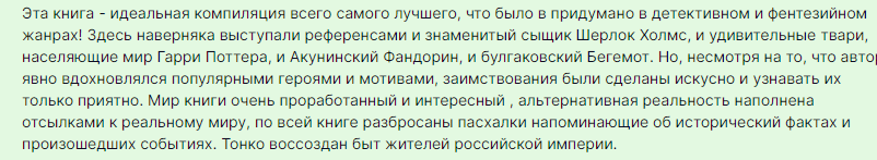 Все эти похожие детали и создают атмосферу, которая угадывается в обеих историях. Будут ли следующие книги о графе-колдуне напоминать, скажем «Статского советника» или другие романы Бориса Акунина, покажет время – и новые отзывы читателей.