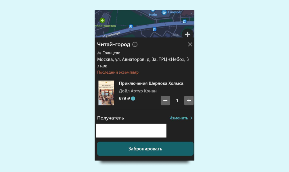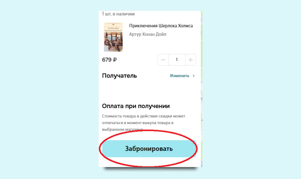4. Откроется окно, где можно ещё раз перепроверить адрес, название книги, ваши данные, а ещё увидеть часы работы магазина. Нажмите на кнопку «Забронировать».