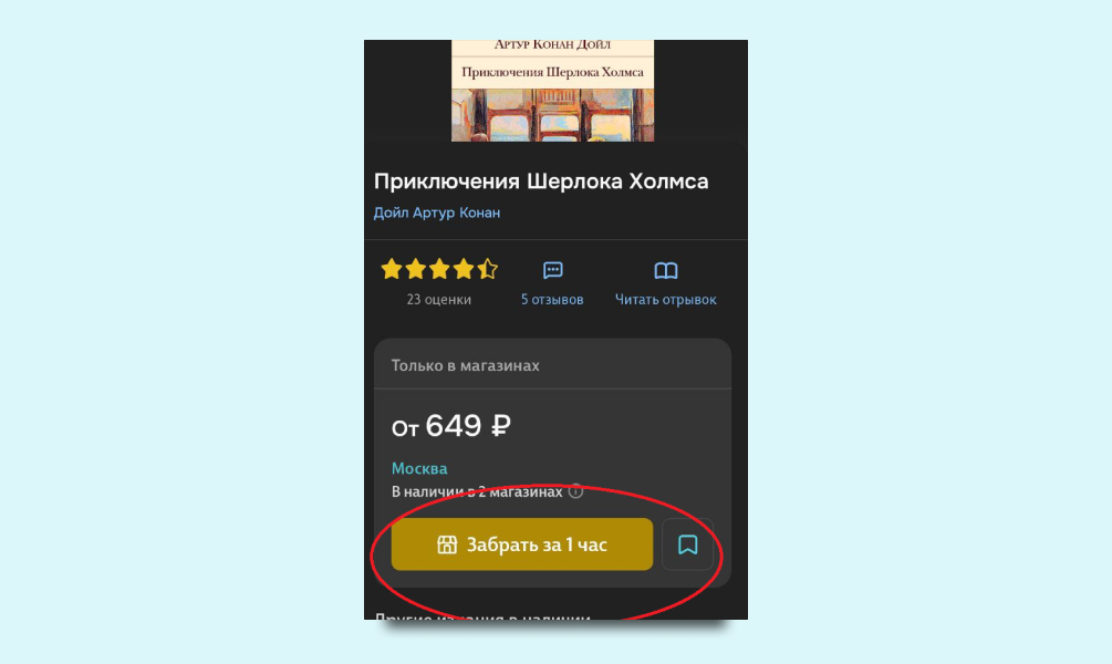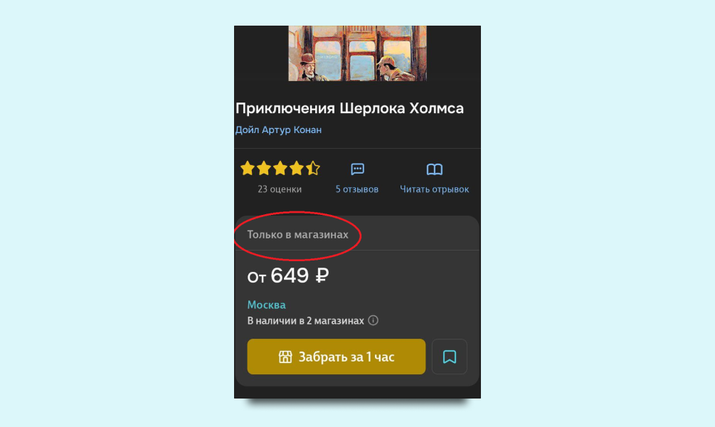 Предположим, вам захотелось прочитать о приключениях Шерлока Холмса, но книга оказалась недоступна для заказа. На странице товара в приложении можно увидеть надписи «Только в магазинах» и «Забрать за 1 час». Что это значит?