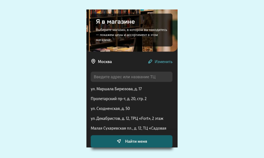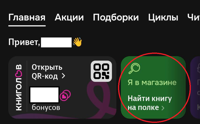 А бывает так, что хочется узнать, есть ли книга в магазине, когда вы уже в нём. Или посмотреть, на какой полке она лежит. На эти случаи тоже всё продумано! На главной странице приложения Читай-города можно найти сервис «Я в магазине». Разберём на примере приложения для андроида. Если у вас айфон — порядок действий будет таким же 😉