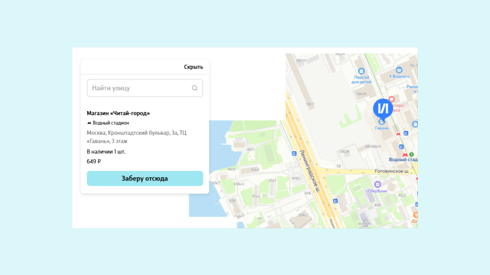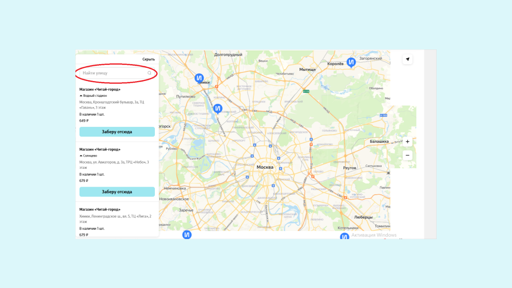 2. Как только вы нажмёте эту кнопку, откроется карта со списком магазинов, где книга в наличии. Можно выбрать удобный магазин на карте и нажать на синий значок. А ещё можно ввести нужный адрес в специальном поле «Найти улицу» или просто полистать список, пока не увидите нужный магазин.