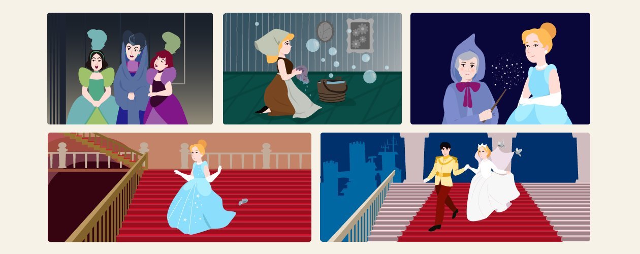 Дальше мы узнаём, как мачеха и сёстры мучают героиню работой, а ещё не разрешают поехать на бал – это завязка.