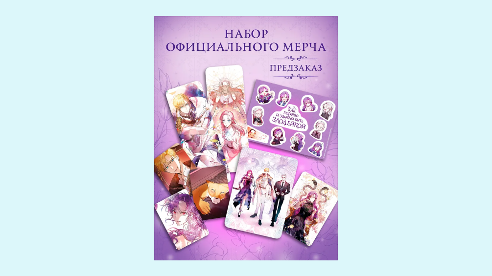 В комплект с книгой входят открытки, постер, закладка, стикерпак и две карточки со злодейкой!