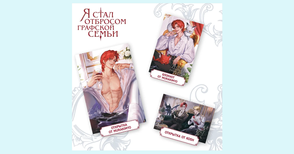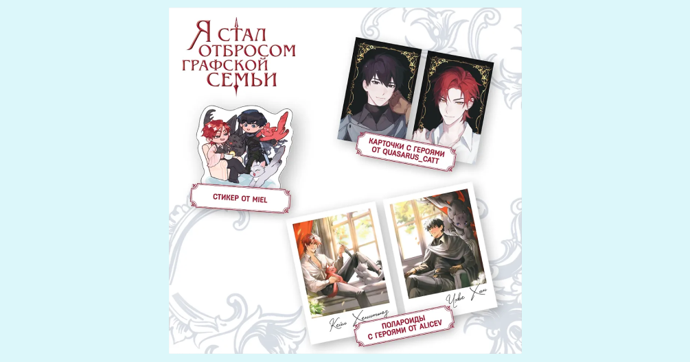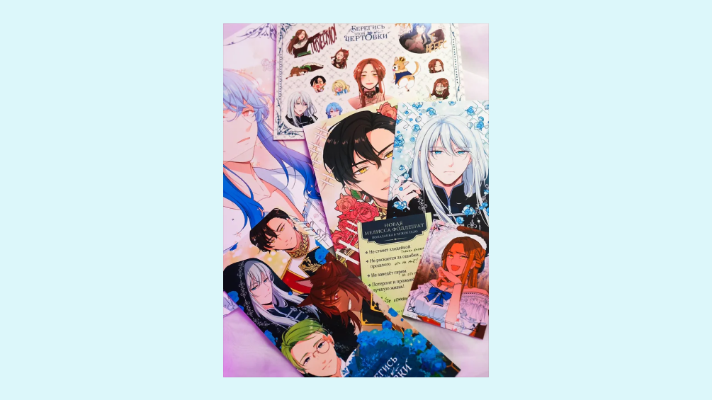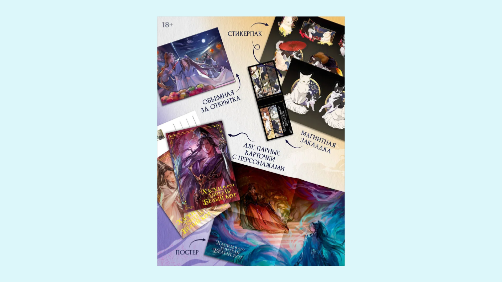 В подарок к истории вы получите 3D открытку, две открытки с персонажами, два стикерпака, магнитную закладку и плакат.