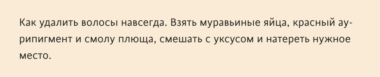 Рекомендации всезнающей Тротулы по эпиляции, конечно, рецептами на основе муравьиных яиц не ограничивались. Если она и не понимала точно суть процесса, то определённо имела чёткое представление о том, каким он должен быть.