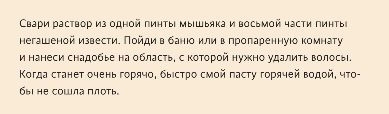 Есть ещё одно старое турецкое средство, отлично помогающее, как считается, избавляться от волос, – паста под названием русма (rhusma). «Книга секретов» 1532 года включает следующую его версию, которая гарантированно удалит растительность с любого места на теле: