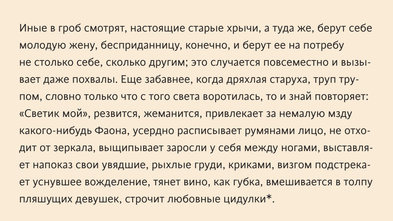 Это также подтверждается по меньшей мере одним письменным документом. Эразм Роттердамский в своём знаменитом сочинении «Похвала глупости» рассказывает о старухе, покупающей молодого любовника: