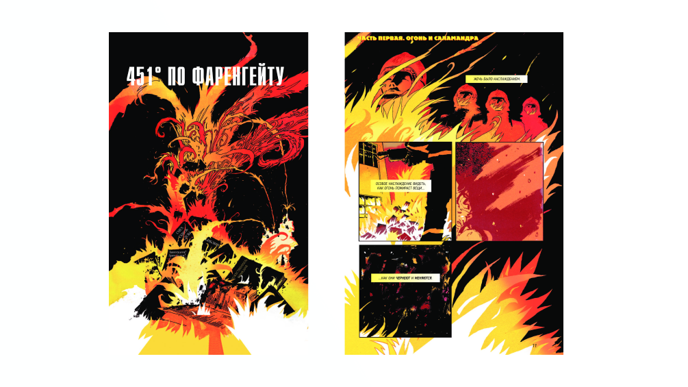 Первой страницей графического романа стала сцена, в которой Тим Гамильтон изобразил фейерверк из фолиантов. Критики из журнала The Georgia Straight отметили: огонь получился настолько реалистичным, что казалось будто он затронет сам комикс.