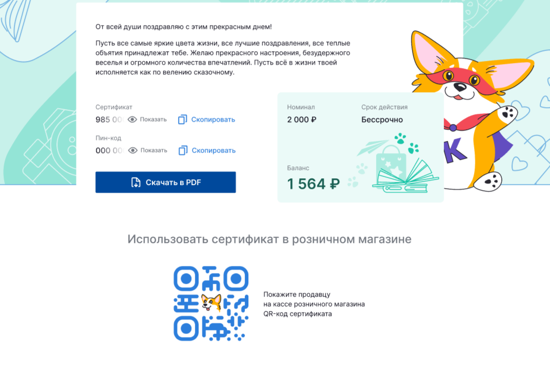 Подарочный сертификат, который вы оформляете онлайн, теперь можно сохранить в формате PDF, чтобы распечатать и преподнести как открытку. Ещё это пригодится, если хотите отправить сертификат получателю в любимом мессенджере.
