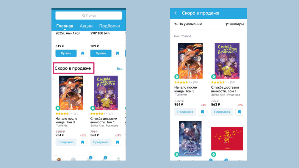 На полке «Скоро в продаже» сначала будут появляться книги, которые могут вас заинтересовать. Их подбирает наш искусственный интеллект CHIT-Ai на основе того, что вы часто покупаете или ищете в поиске. Так вы раньше всех увидите, когда откроется предзаказ на продолжение любимой истории или новинку, которая наверняка вас увлечёт.
