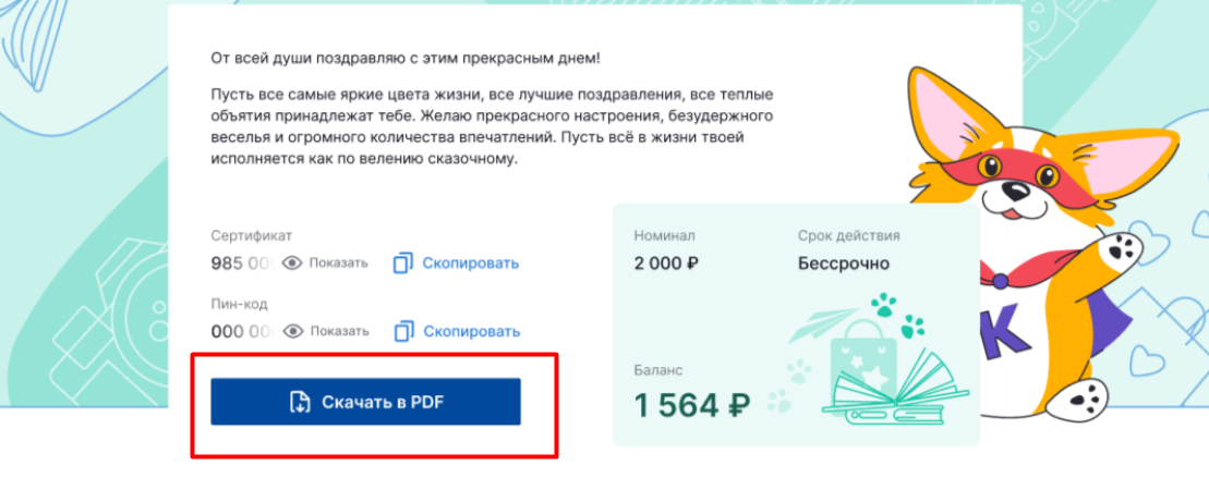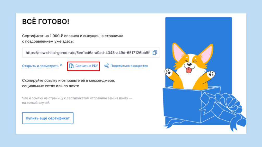 Чтобы сохранить будущий подарок, нажмите на кнопку «Скачать в PDF», когда после покупки перейдёте на страницу «Всё готово».