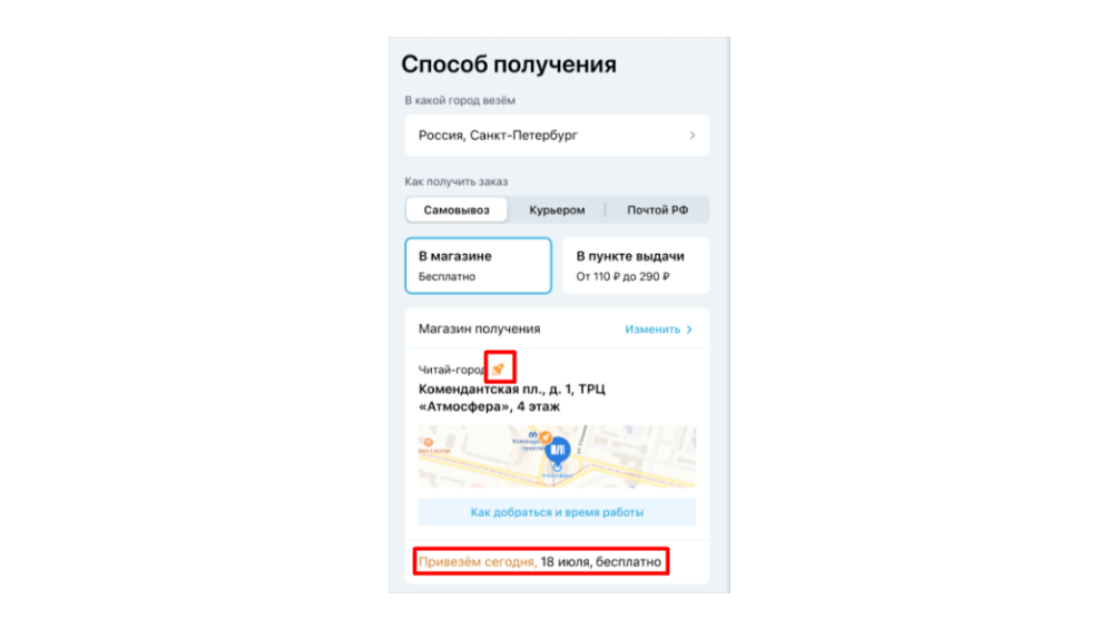 Не так давно мы запустили «Ракету» – функцию, благодаря которой в получаете свой заказ в тот же день, когда оформили. Теперь она появилась и в приложении. Например, вы можете поехать на работу, по дороге заказать книги, а перед тем, как придёте домой, забрать их.