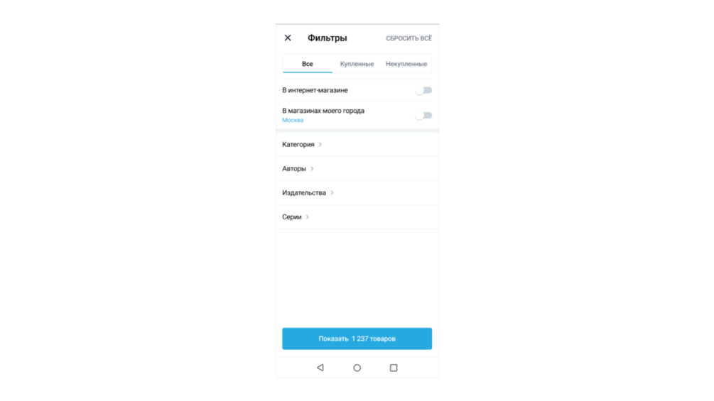 В «Закладках», куда вы добавляете интересующие книги, появились фильтры по категориям, авторам, сериям, издательствам и наличию на сайте или в магазинах. Не нужно нажимать на каждую карточку, чтобы посмотреть, где её сейчас можно купить.