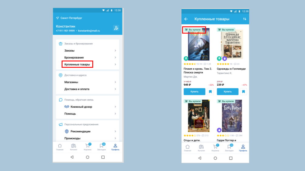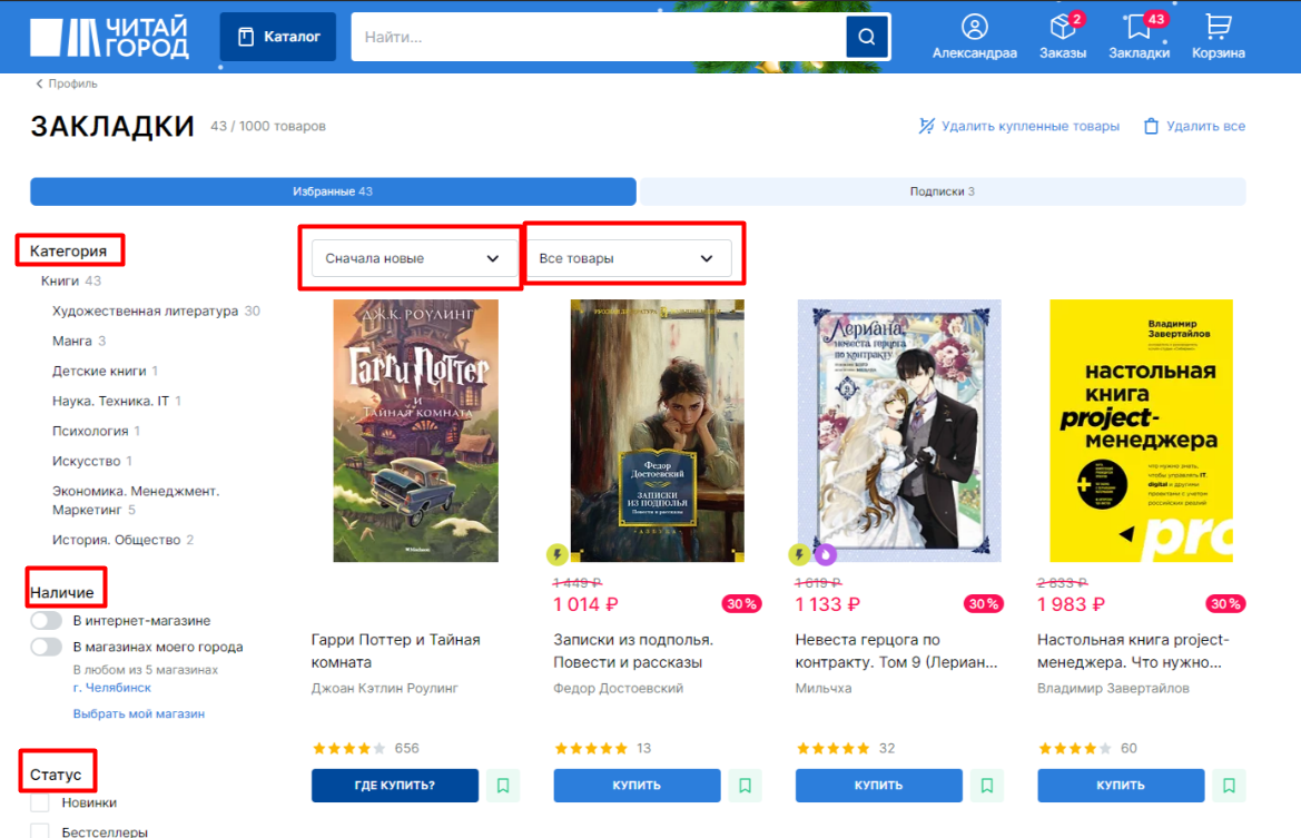 Ещё в «Закладках» теперь есть сортировка по новизне, стоимости книг. Благодаря этим функциями вы не запутаетсь в разделе, даже если добавили туда сотни книг, и сможете быстро отыскать нужный в данный момент том. А если вы не помните, что из сохранённого уже есть в вашей библиотеке, а что нет – поможет сортировка по купленным и некупленным товарам.