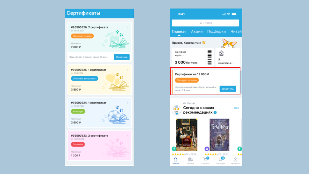 А если вы сейчас захотите оформить подарочный сертификат, на главной странице приложения появится картинка, где будет висеть заказ, пока вы его не оплатите. Так проще не забыть.