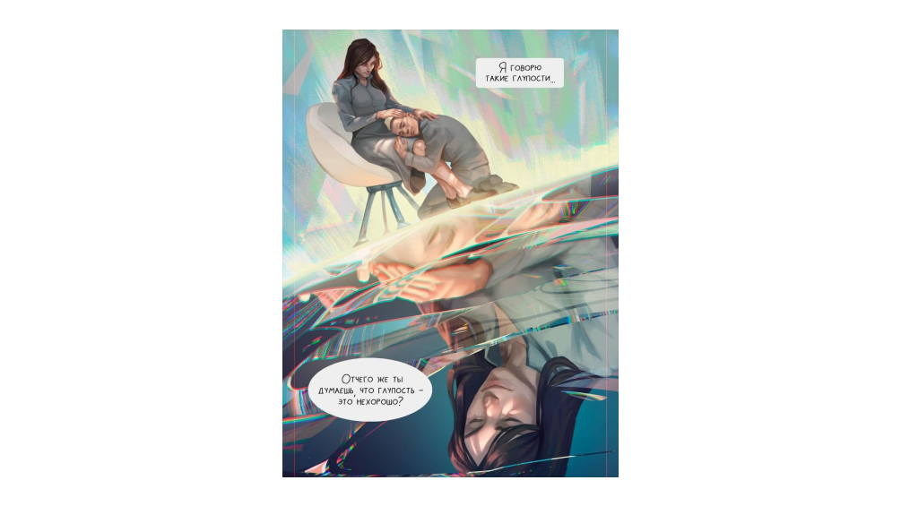 Стиль текста романа просто потрясающий. Он читается как музыка: отрывистые насыщенные короткие предложения, постоянная смена интонации, обилие необычных метафор, сложных описаний и выдуманных, деформированных слов. Хоть главный герой и математик, и многие его описания отталкиваются от строгости цифр, формул и геометрии, основная тема романа – любовь, можно даже сказать, чувства в целом. Так что во всём этом довольно мало конкретики, а много возвышенности и образности. Переносить такое в иллюстрации было тяжёлым и неблагодарным трудом. В процессе визуализации и конкретизации неизбежно потерялась та абстрактность, которую может позволить себе текст.