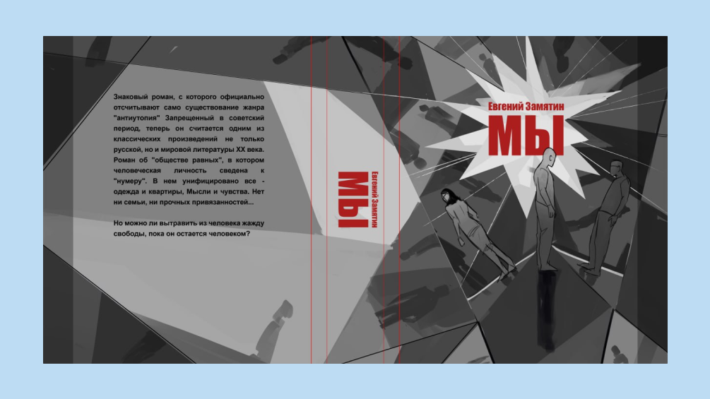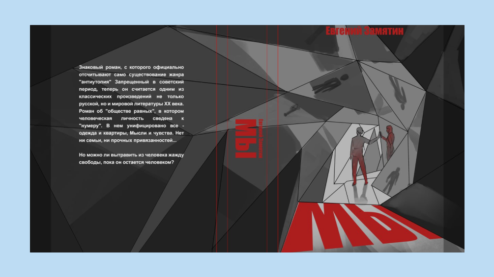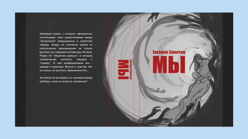 Разумеется, первым делом я изучила уже существующие варианты визуализации этого романа. Обложки прежних изданий, а также экранизацию, вернее её трейлер, так как фильм, насколько мне известно, так и не вышел. Старые издания в основном оформлялись в стиле советского конструктивизма, что хоть и является самой первой и очевидной ассоциацией к содержанию книги, но всё-таки мне не подошло. Хотелось осовременить визуальный ряд и сделать его более реалистичным. А что касается экранизации, она мне не очень приглянулась. Гораздо больше меня вдохновляли воспоминания о фильме «Эквилибриум» – одним из любимых фильмов моего детства. На мой взгляд, его стилистика и атмосфера намного больше подходят для произведения Замятина.