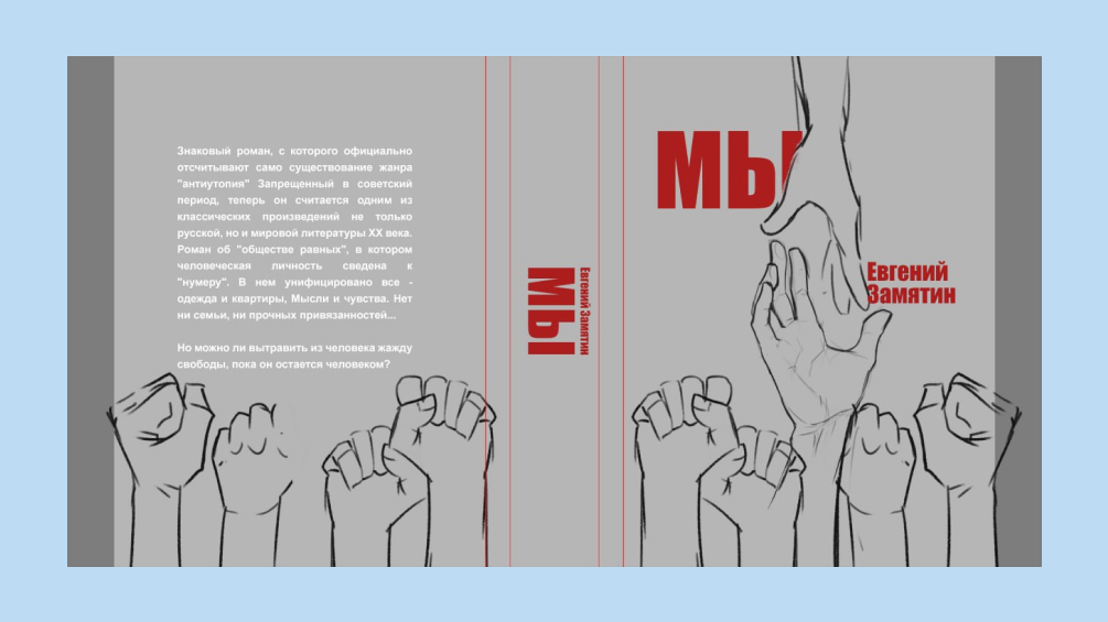 Общим для всех идей было одно – мне было важно поместить название романа в центр композиции, сделать его массивным, монументальным, крупным. В этом коротком слове «мы» для меня очень много давления, оно как будто поглощает героев, уничтожает их. Поэтому в финальной версии обложки название занимает даже больше места, чем персонажи.
