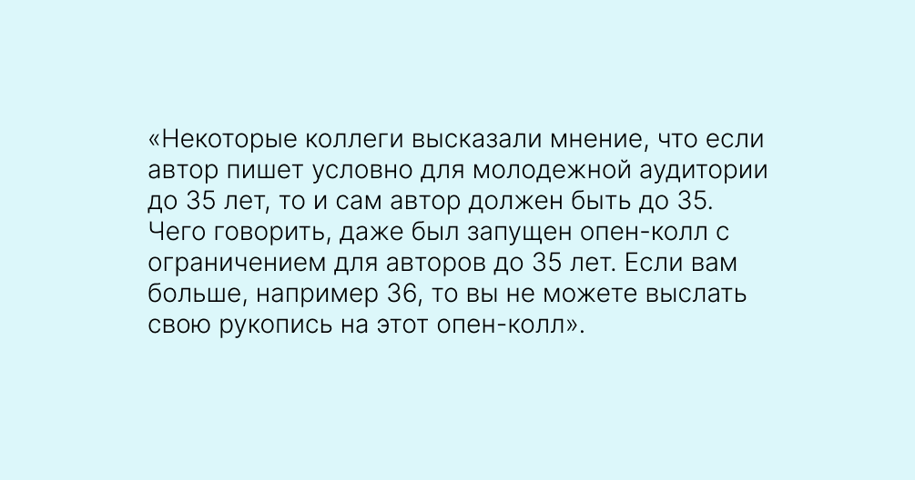 Автор отметил, что не против давать шанс взрослым писателям. Ведь у каждого человека — разный багаж знаний. Одни могут не чувствовать молодёжь уже в 30 лет, а другие даже в 45 лет будут ощущать себя в своей тарелке. Важнее отталкиваться от собственного восприятия, чем от возрастных рамок.
