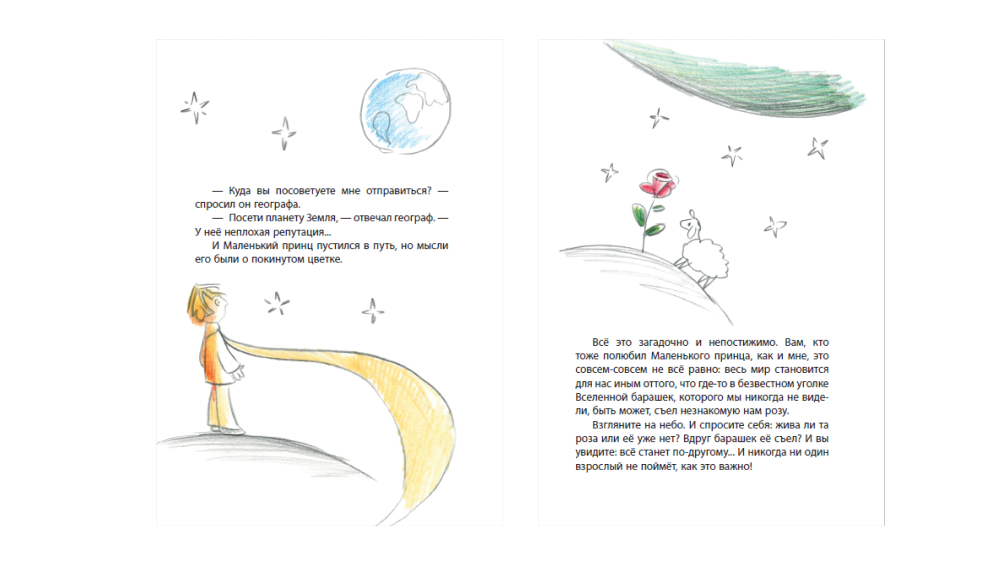 Если заглянуть в эту книгу, можно увидеть, как писатель представлял своих героев: в ней собраны иллюстрации, который создал сам Антуан де Сент-Экзюпери. А русским текстом занималась известная переводчица Нора Галь.