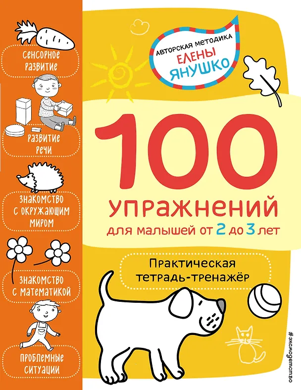 Развивающее пособие включает в себя несколько блоков: сенсорное восприятие (цвет, форма, размер), задания на развитие речи, обучение счету до трëх, знакомство с домом и семьёй, несколько страниц про психологию малыша и сложные ситуации.