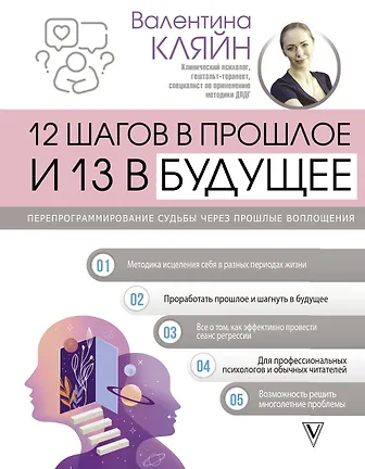 12 шагов в прошлое и 13 в будущее — это книга о том, как регрессология помогает справиться со своими травмами и проблемами, которые на первый взгляд могут быть и не связаны с психологией. Здесь описана техника работы с подсознанием, которая помогает человеку найти в своем прошлом первоисточник текущих жизненных проблем, перепрожить их с другими чувствами, освободиться и вернуться в настоящее время с новыми ресурсами и силами. На реальных примерах работы с клиентами автор рассказывает о преимуществах регрессивной терапии, а также об ошибках, которые могут быть допущены, и о результатах практики.