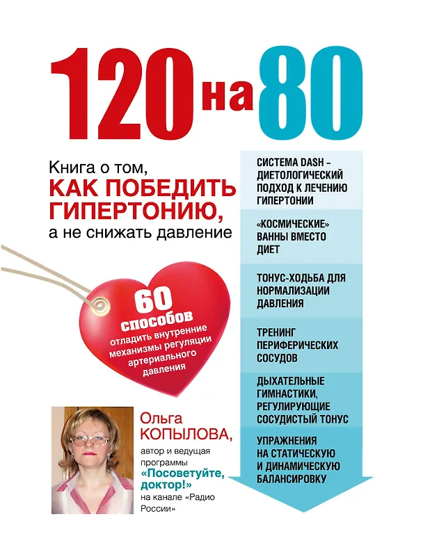 120 на 80 Книга о том как победить гипертонию а не снижать давление. У нас в семье давление у все повышенное. Лечате его путем назначения лекарств, снижающих давление и все. И потихоньку то оно растет. Я вижу по своей свекрови и бабушке, что меня ждет. Методика Ольги Копыловой меня заинтересовала именно тем, что она предлагает лечит болезнь- питанием, лекарствами, сменой образа жизни. Хочу попробовать, так как у меня уже сейчас скачки давления бывают. Книга очень интересная.