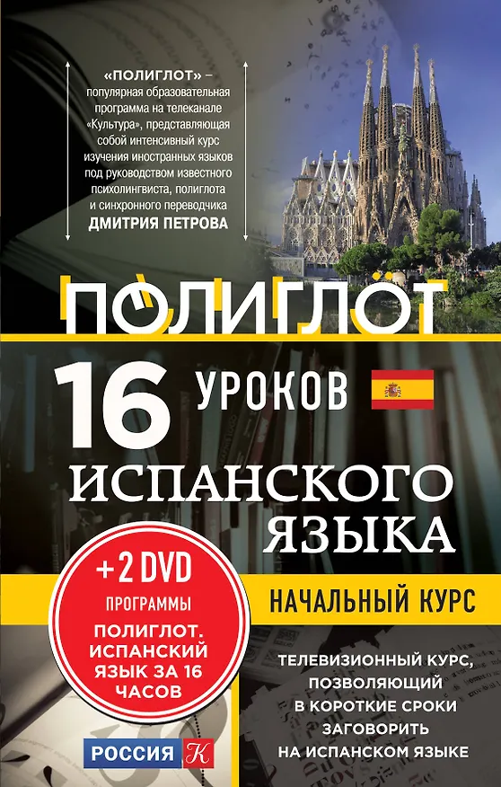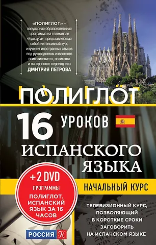 16 уроков испанского языка Начальный курс (+2DVD). Отличная книга для тех, кто хочет изучить язык с нуля. Покупала его дочке, мы были в Испании, и у нее возникло желание выучить этот язык- в следующем году хочет ехать сама туда, с друзьями, на машине. За две недели она сильно продвинулась,уже говорит немного. Андрей Кржижевский предлагает какую то особенную методику, рассчитанную на овладение устной речью как раз. Книга карманного формата и к ней даются два диска. Сама тоже на досуге хочу выучить.