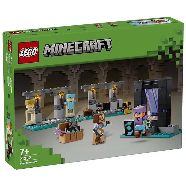 Игрокам Minecraft в возрасте от 7 лет и старше понравится знакомиться с оружием и функциями Minecraft с помощью набора LEGO Minecraft «Оружейная палата» (21252). Этот конструктор «ЛЕГО» — отличный подарок для детей, предоставляющий игрокам идеальную возможность отправиться в творческие приключения Minecraft. В состав этой сборной игрушки для детей входят две знакомые фигурки: героиня боевиков Minecraft Алекс со своим щитом и алмазным мечом и трудолюбивый Бронник. Вам предстоит исследовать 3 среды: рабочая зона с наковальней, печью, точильным камнем и котлом, наполненным лавой; комната для демонстрации брони, в сундуке которой находится золотой топор, зачарованный трезубец, незеритовый меч, щ