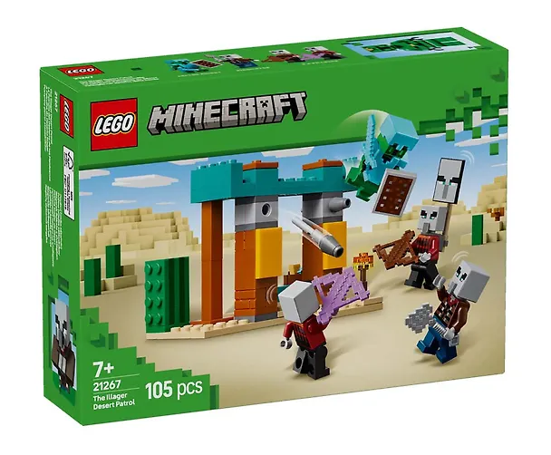 В этом небольшом наборе LEGO для детей от 7 лет и старше есть много веселья для игроков Minecraft. С 4 фигурками LEGO Minecraft, забавными функциями и аутентичными аксессуарами, «Сельский патруль в пустыне» (21267) — это мини-игрушка с мегаэкшеном Minecraft.