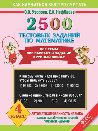 Елена Нефедова, Ольга Узорова «2500 тестовых заданий по математике. Все темы. Все варианты заданий. Крупный шрифт. 4 класс» и выбрать удобный способ его получения: самовывоз, доставка курьером