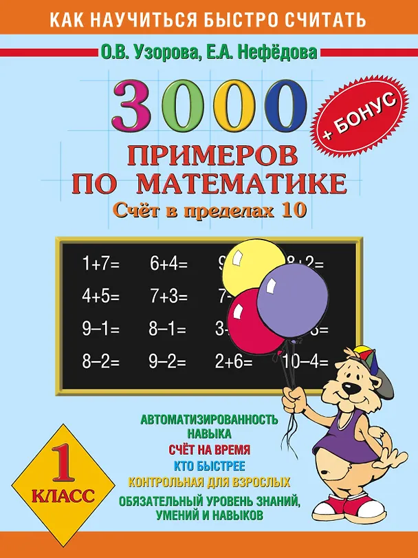 Пособие содержит 3000 математических примеров по теме «Счет в пределах 10». Оригинальное построение материала позволяет обеспечить более глубокое его усвоение. Как показывает практика, ученик полностью освоил программу, если решает и записывает ответ по истечении 4-7 секунд. В этом случае можно говорить, что навык счета доведен до автоматизма. На каждой странице приведены 7 столбиков, в среднем по 40 примеров. В конце столбика записывается время. В нижнем левом углу обозначены контрольные цифры: идеальное время решения одного столбика, удовлетворительное и результат, который должен заставить ученика задуматься. Чтобы достичь отличных результатов, каждый день следует решать по одной странице. Для учеников, быстрее других выполнивших задание, а также для максимально эффективного усвоения темы в конце каждой страницы даны усложненные задания-«бонусы». Пособие может быть использовано на уроках математики, а также для работы дома.