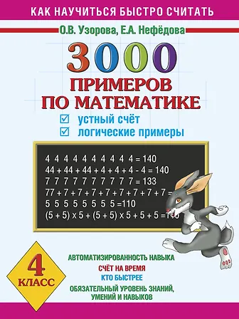 Пособие содержит 3000 логических примеров по математике для 4 класса по темам «Сложение и вычитание», «Сложение, вычитание, умножение и деление без скобок», «Сложение, вычитание, умножение и деление со скобками». Систематическое выполнение этих заданий развивает логическое и математическое мышление, память и внимание. По усмотрению учителя примеры можно использовать как для олимпиадных работ и заданий повышенной сложности, так и для повторения и закрепления пройденной темы. Для лучшего усвоения материала рекомендуется решать по десять примеров в день. Для проверки знаний учащихся и самопроверки даны ответы ко всем заданиям. Они расположены так, что при необходимости учителя или родители могу