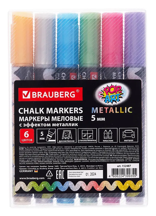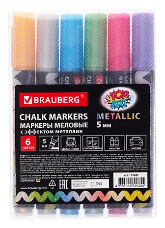 Маркеры меловые хорошего качества. Хоть и указано, что у маркеров есть металлический эффект, но его практически не видно, прям слабо заметно. Рисуют маркеры не сильно тонко, но и не толсто. Все цвета яркие, хоть в набор входит всего шесть маркеров, по рисовать или разукрасить вполне достаточно такого количества. Цена немного завышена, но зато качество отличное. Пользуемся маркерами уже четвертый месяц, все устраивает.
