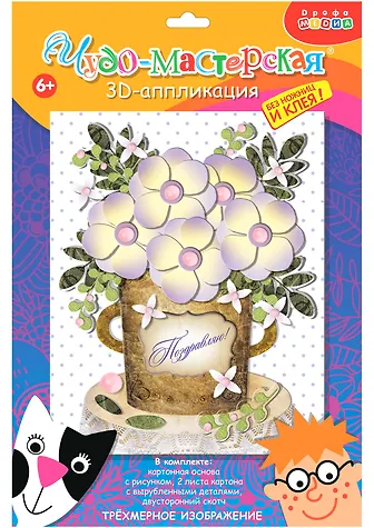 3D-аппликация – современный и очень увлекательный вид творчества. Данный набор позволит создать необыкновенно выразительную 3D-картину. Яркие и красочные детали изображения, выполненные из плотного картона, выступают над основой, создавая причудливый и сказочный мир. Этот удивительный 3D-эффект возникает благодаря использованию объёмного двустороннего скотча. Готовое изделие смотрится необыкновенно эффектно.