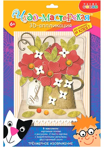 3D-аппликация – современный и очень увлекательный вид творчества. Данный набор позволит создать необыкновенно выразительную 3D-картину. Яркие и красочные детали изображения, выполненные из плотного картона, выступают над основой, создавая причудливый и сказочный мир. Этот удивительный 3D-эффект возникает благодаря использованию объёмного двустороннего скотча. Готовое изделие смотрится необыкновенно эффектно.