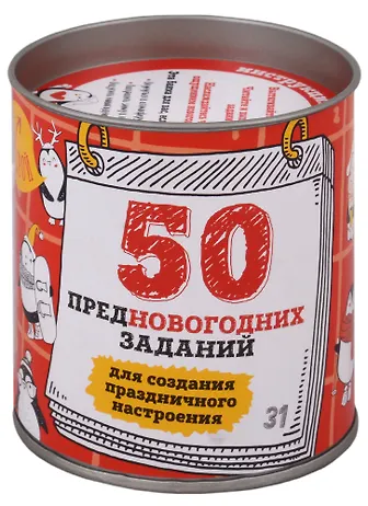 Если вы хотите окунуться в атмосферу самого волшебного праздника уже сейчас и в полной мере подготовиться к его приближению – эта банка для вас! Наслаждайтесь и делитесь с близкими людьми волнующей радостью предвкушения Нового года. Под крышкой собраны самые душевные и увлекательные задания для создания праздничного настроения. Каждый день вытягивайте по одной или несколько бумажек, выполняйте задания и наслаждайтесь великолепным ощущением новогодней сказки!