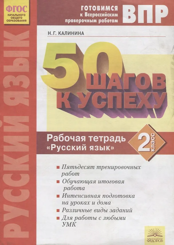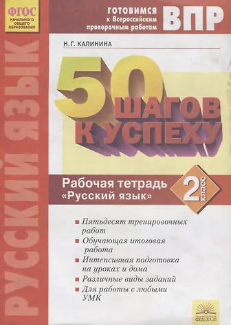 Рабочая тетрадь "ВПР. 50 шагов к успеху. Русский язык. 2 класс" предназначена для подготовки второклассников к итоговым работам за год, а также к Всероссийской проверочной работе (ВПР) по русскому языку. В каждой из пятидесяти тренировочных работ предлагаются вопросы и задания, охватывающие основные темы курса русского языка во 2 классе, что отличает эту тетрадь от других аналогичных изданий, построенных на повторении ранее изученного материала по тематическому принципу. В связи с тем, что в ВПР по русскому языку включены также задания по работе с текстом, в тетради даны работы на отработку умений по определению главной мысли текста, составлению его плана.