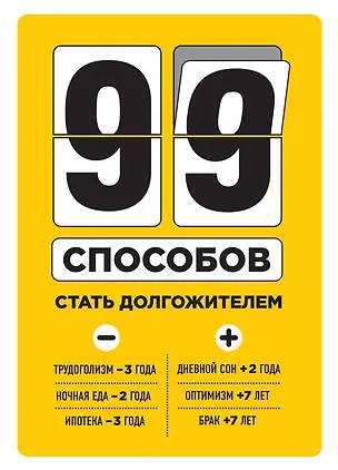 В книге «99 способов стать долгожителем» в каждой главе описывается один фактор, его положительные и отрицательные стороны.