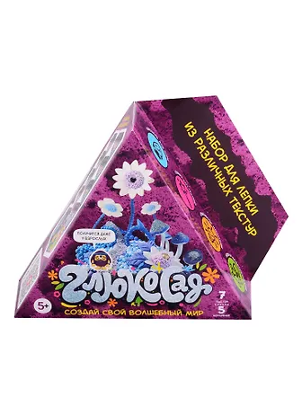 Это необычный набор для лепки из различных текстур. Из легкого пластилина, шарикового пластилина и различных украшений, можно создать нечто из ваших фантазий, что потом украсит стол или полочку. Набор развивает мелкую моторику и креативность. Глюкосад удивительно легко лепить, ведь всё, что вы слепите может быть Глюкосадом!