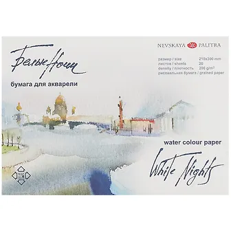 Акварельная бумага "Белые ночи" специально предназначена для работы с водорастворимыми красками. Бумага выдерживает подчистки и смывки в процессе работы, может использоваться для работы в техники по сырому.