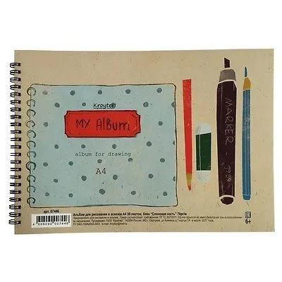 Альбом для эскизов формата А4 состоит из 30 листов на спирали. Внутренний блок - бумага высокого качества плотностью 70 г/кв.м. Цвет блока - слоновая кость. Альбом предназначен для эскизов и зарисовок. Произведено в России.