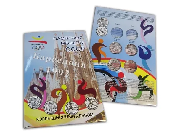 Альбом-планшет блистерный, для памятных монет СССР серии "Барселона, 92" на 6 монет. Монеты посвящены ХХV летним Олимпийским играм 1992 года в Барселоне. В серию вошли 6 монет: Бег, Борьба, Велоспорт, Метание копья, Прыжки, Тяжелая атлетика. Блистер позволяет рассмотреть монету со всех ракурсов, не вынимая её из альбома.