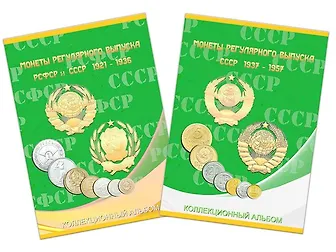 Альбом-планшет для монет СССР регулярного выпуска с 1921 по 1957 год. Монеты расположены по годам. Все ячейки подписаны, а редкие(раритетные монеты имеют фото). 1 том монеты выпущенные с 1921 по 1936 год, 2 том монеты выпущенные с 1937 по 1957 год. Альбом-планшет сделан из плотного ламинированного картона, монеты просто вставляются, плотно держатся, легко вынимаются.