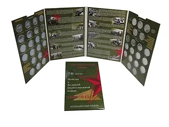Альбом-планшет блистерный для памятных монет России "70-летие Победы в ВОВ 1941-1945 гг" на 40 ячеек. В альбом входят монеты номиналом 5 рублей 2014, 2015, 2016 гг., и 10-рублёвые биметаллические монеты 2015 г. Блистер позволяет рассмотреть монету со всех ракурсов, не вынимая её из альбома.