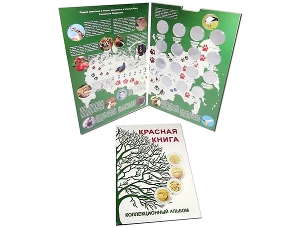 Альбом-планшет блистерный для монет серии "Красная книга" 1991-1994 гг.. Серию монет "Красная книга" начали выпускать еще в СССР в 1991. В 1992-94 годах серию продолжил выпускать уже Банк России. В серию вошло 15 монет с изображением редких животных. Монеты номиналом 5, 10 и 50 рублей все одинакового диаметра. Блистер позволяет рассмотреть монету со всех ракурсов, не вынимая её из альбома.