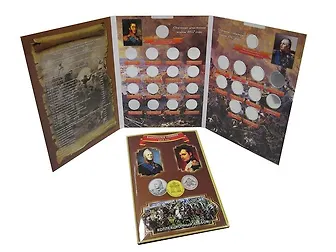 Альбом-планшет блистерный посвященных 200-летию победы в Отечественной войне 1812г. В альбом входят монеты номиналом: 2 рубля, серия: «Полководцы и герои Отечественной войны 1812 года»; 5-ть рублей, серия: «Сражения и знаменательные события Отечественной войны 1812 года и заграничных походов русской армии 1813 - 1814 годов», 10-ть рублей "Триумфальная арка". Блистер позволяет рассмотреть монету со всех ракурсов, не вынимая её из альбома.